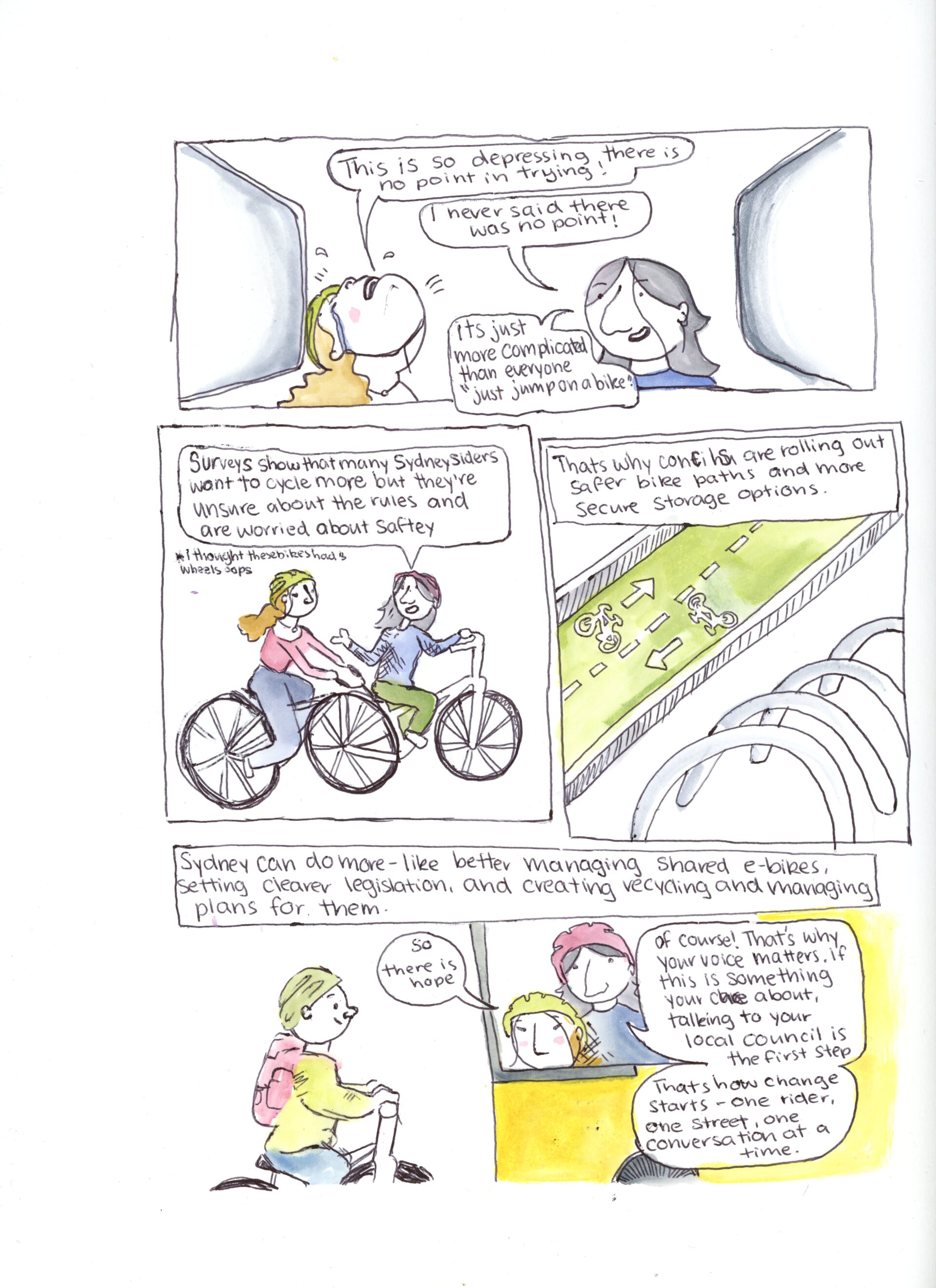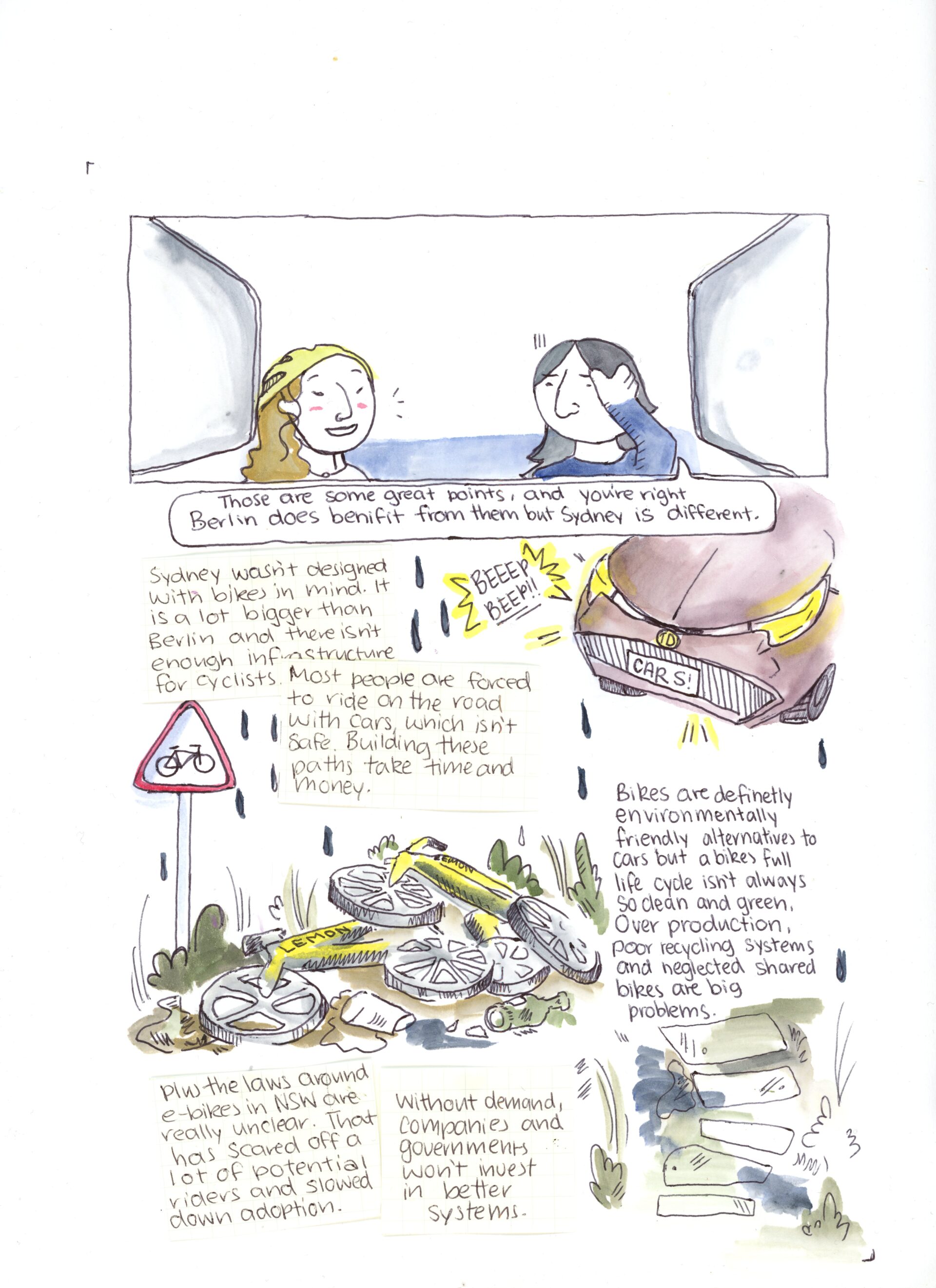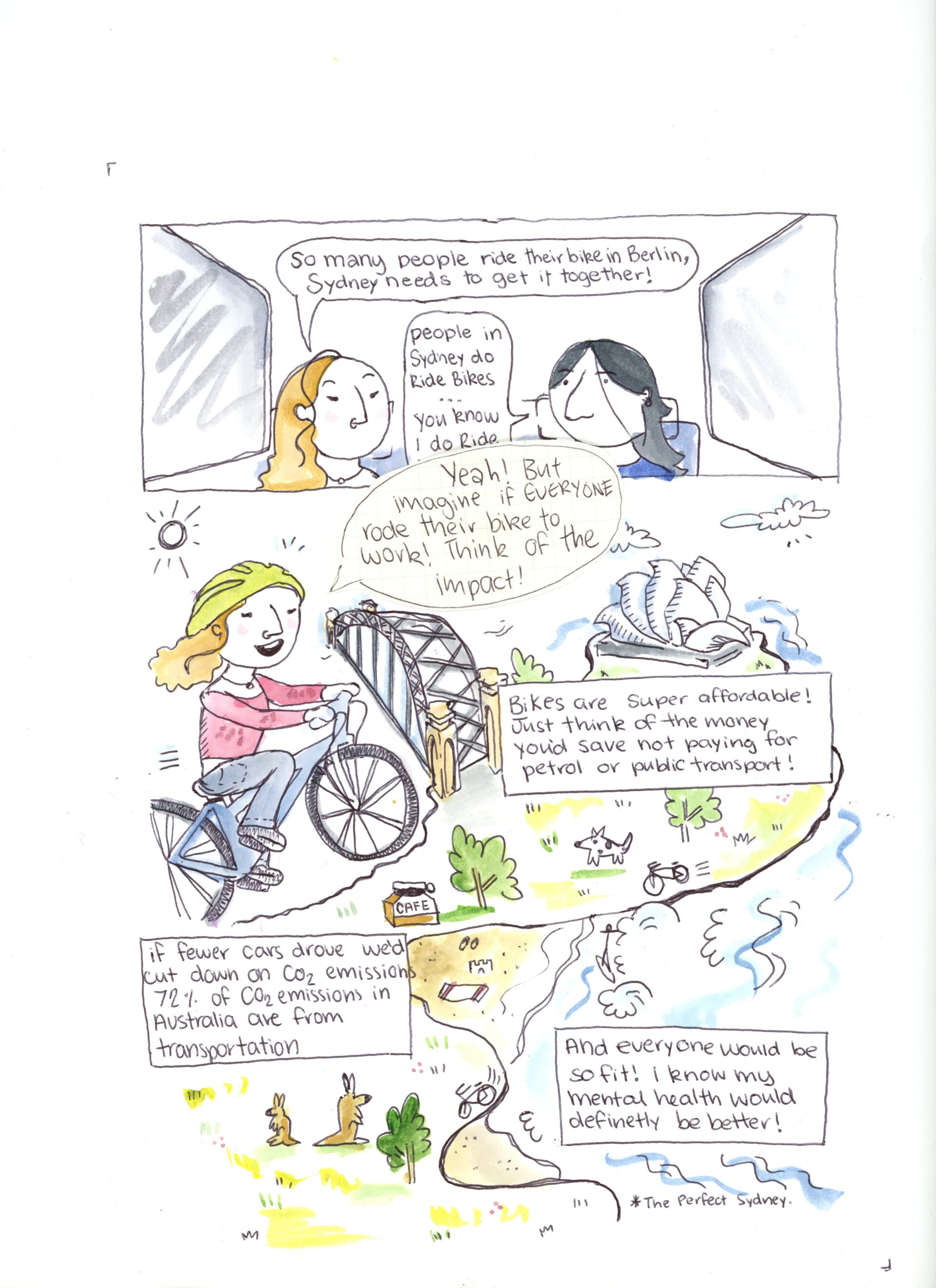 I decided to explore a difference I had noticed from my time in Berlin vs Sydney, which was the difference in people cycling. After conducting research into this area, I created this comic, which aims to start the conversation about the wicked problem of Sydney’s cycling culture.